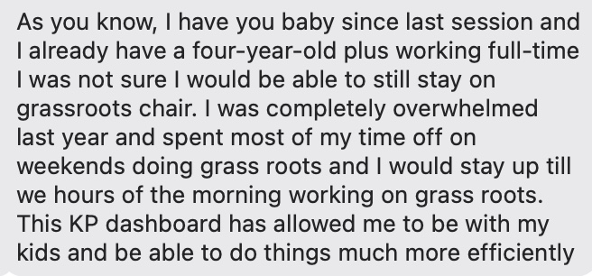 We caught wind of KP Dashboard at an AOA meeting about 3 years ago from another state that mentioned it during a breakout session. After our humbling defeat, we reached out to Dr. Adam Parker for a demonstration of his technology. We knew right away we had to have his product in our arsenal, not only to improve our fundamental organizational processes, but to give us new powers we had never had with our grassroots communication. Dr. Parker's reputation and his own involvement in the exact same efforts in his state gave us the confidence to move quickly.